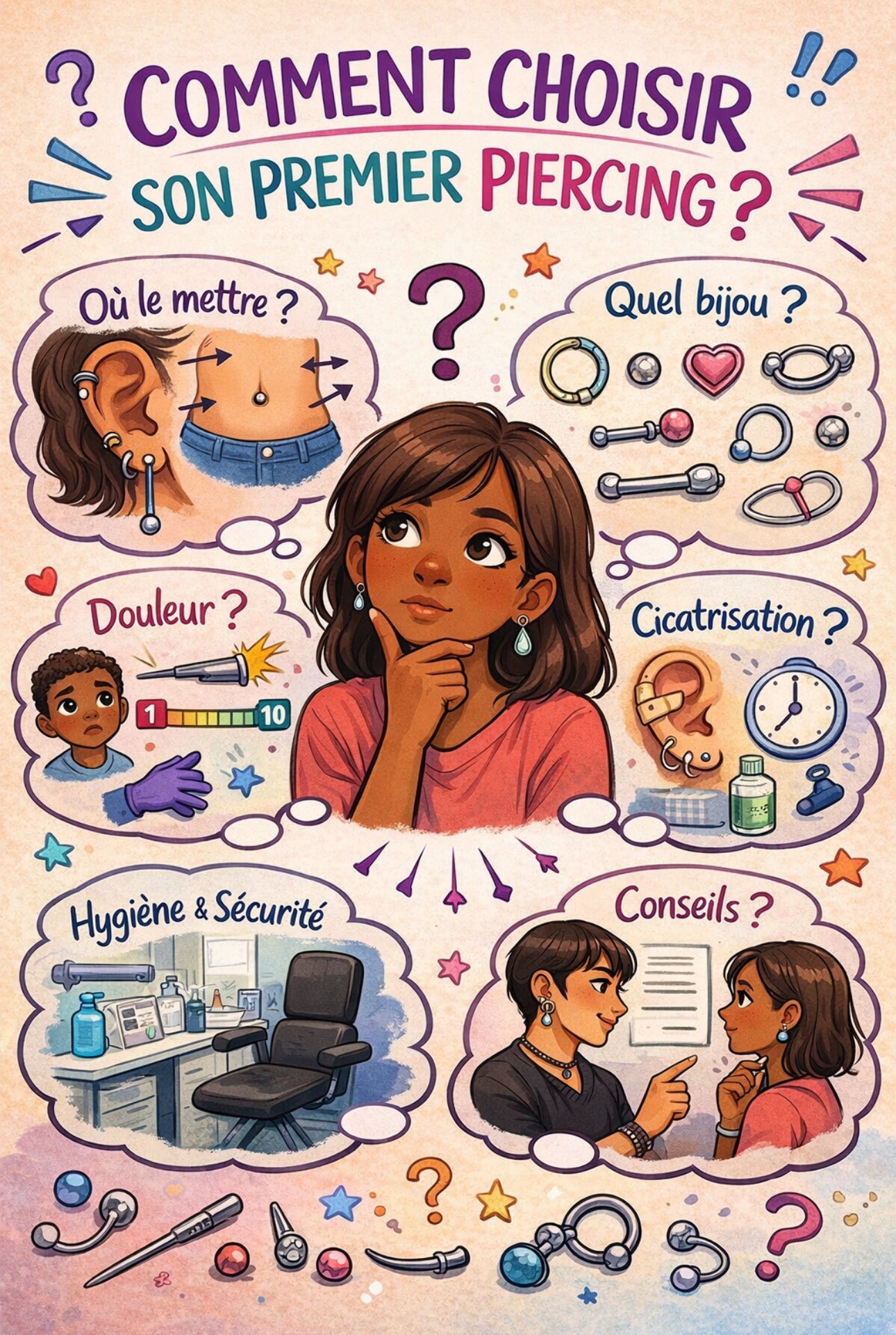 Se faire percer pour la première fois est un mélange d’excitation et d’appréhension. Pour que cette expérience soit un beau souvenir, il est essentiel de bien s’informer. Voici comment choisir ton premier piercing de manière éclairée.