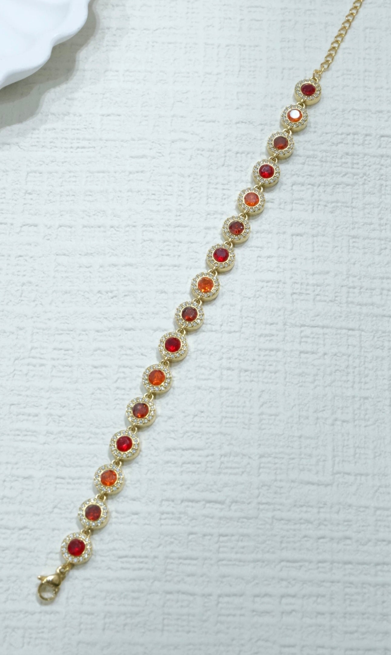 Somptueux bracelet doré orné de pierres rouges éclatantes, chacune finement sertie et entourée de petits cristaux scintillants.