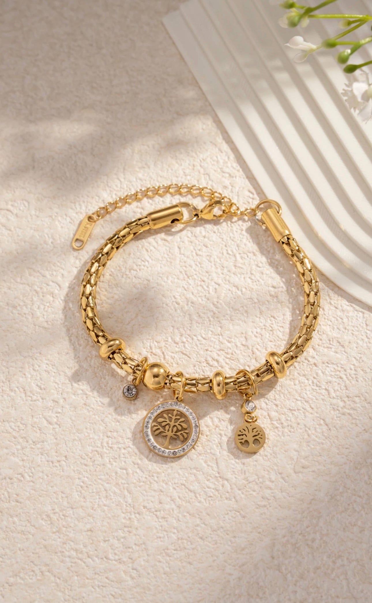Découvrez l’harmonie du bracelet, une pièce délicate en acier inoxydable doré ornée d’un pendentif Arbre de Vie, symbole d’équilibre, de croissance et de connexion à la nature.